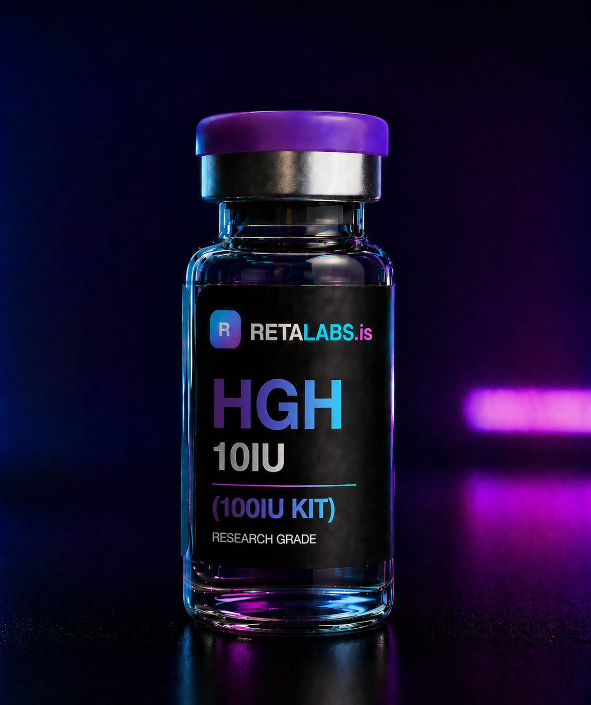 RetaLABS HGH 100IU is supplied as ten 10IU lyophilised vials of recombinant human growth hormone (somatropin) — a 191-amino-acid protein identical in sequence to pituitary-derived GH. This format is used in research studying the GH/IGF-1 axis, body composition modulation, protein synthesis, and metabolic effects of growth hormone signalling.