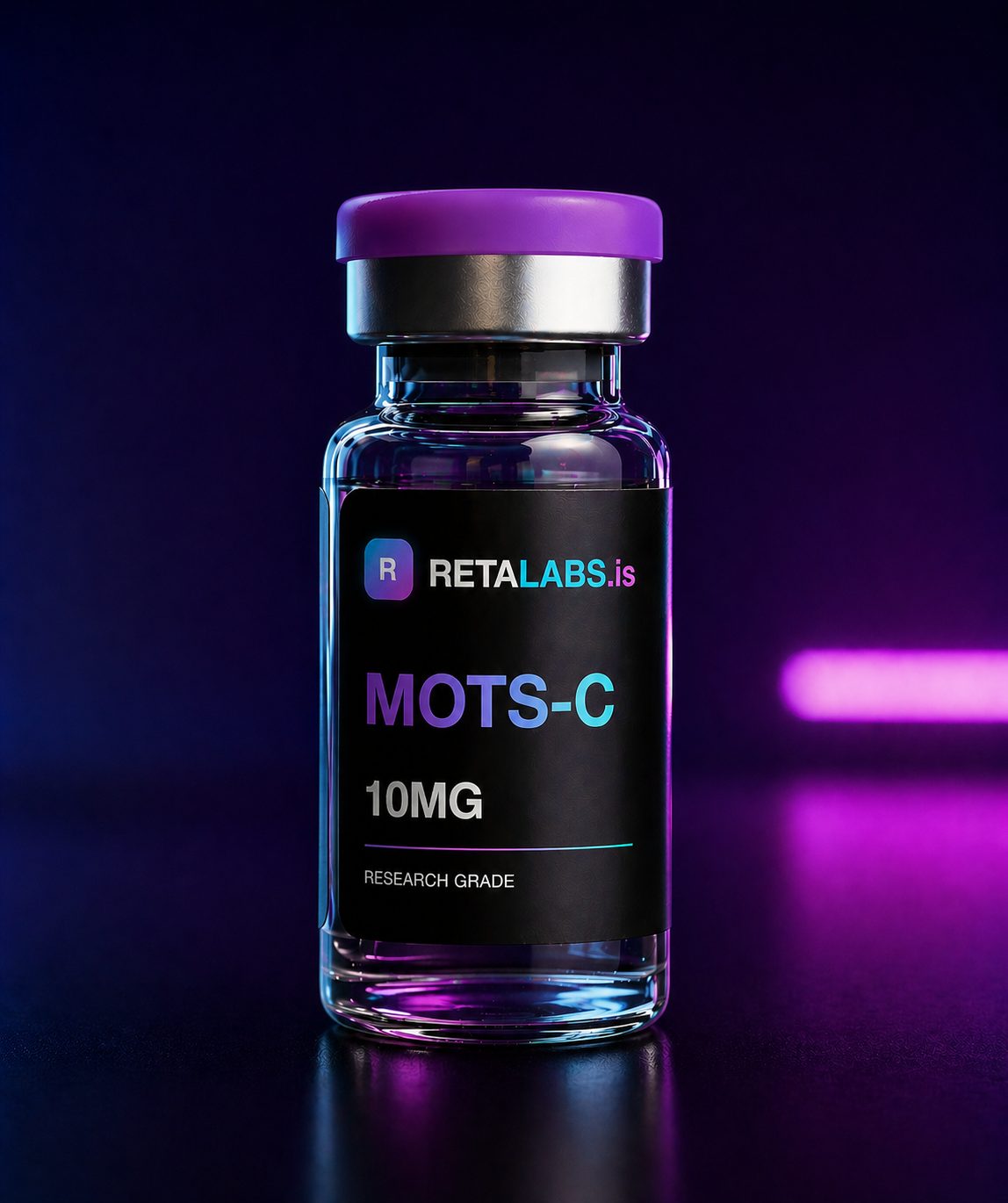 RetaLABS MOTS-c 10mg is a lyophilised research vial of the mitochondrial-derived peptide MOTS-c (Mitochondrial Open Reading Frame of the 12S rRNA type-c). This 16-amino-acid peptide, encoded within the mitochondrial 12S rRNA gene, is researched as a metabolic regulator with properties analogous to an exercise mimetic.